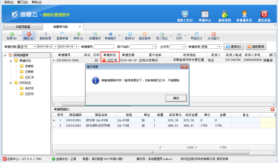 有些客户想删除已红冲的单据时,发现已红冲的单据删除不了,如下图所示,提示“销售单删除失败!错误信息如下:当前单据已红冲,不能删除!”,那么如何删除已红冲的单据呢?