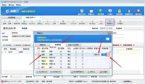 参数设置完成后,在功能导航栏点击“销售管理”,新开一张销售单。打开界面设计,将目光聚焦在“单据明细”的金额上。在这里,您可以根据实际需求,灵活设置金额的取值方式。选择“计算公式”,并将取值设置为“{规格}*{数量}*{单价}”,最后保存计算公式和界面设计。这一系列操作,如同为软件注入智慧的灵魂,让它能够按照您的要求精准计算金额。详细操作步骤如下方图示: