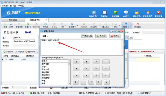 设置工作完成后,就可以开启实战应用啦!假设您要开具一张大理石的销售单,大理石规格为30*20,数量为2,单价为2。在软件中轻松选择该商品,输入相应规格、数量和单价,软件瞬间就能根据您之前设置的公式计算出金额:30*20*2*2