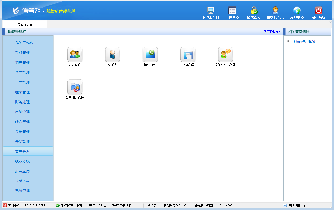 客户关系管理包括潜在客户管理、联系人管理、销售机会管理、合同管理、跟踪回访管理、客户服务管理等功能。