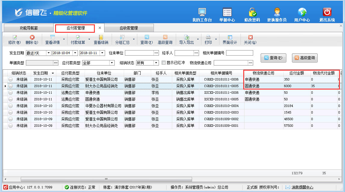 物流运费结算功能通过在销售出库单和采购入库单中输入物流快递运费金额和物流快递运费代收金额、代付金额。对生成的运费应付款、运费代付金额和代收金额可以在往来管理应收应付款管理中进行结算操作。支持定期结算(如月结)和付现款的情况。