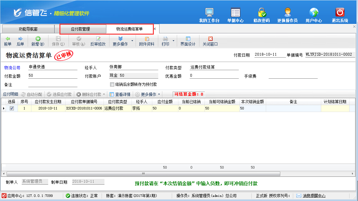 物流运费结算功能包括:物流运费应付款结算、物流运费代付结算、物流运费代收结算 在往来管理—》应付款管理中进行运费应付款结销且对应生成物流运费结算单。