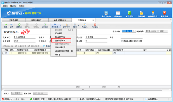 打开收款结算单界面,在工具栏更多操作下点击“查看相关单据”,系统会直接打开相应的销售出库单。可对销售出库单进行反审修改操作,在销售出库单界面反审修改后,收款结算单即可同步修改。如下图所示,修改销售出库单“本次收款账户”后,收款结算单可同步进行修改。