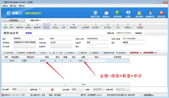 设置工作完成后,就可以开启实战应用啦!假设您要开具一张大理石的销售单,大理石规格为30*20,数量为2,单价为2。在软件中轻松选择该商品,输入相应规格、数量和单价,软件瞬间就能根据您之前设置的公式计算出金额:30*20*2*2